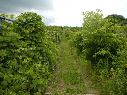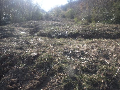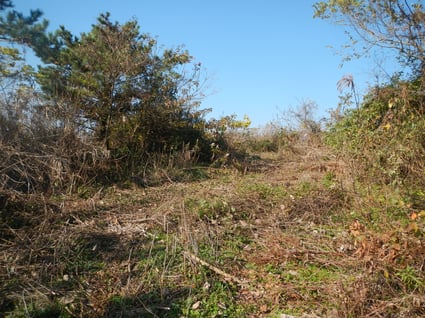 約20年前、大規模な事業計画の一環として、既存の木々が根こそぎ抜かれ、ゴルフ場整備のための作業道に変わった場所です。 しかし、事業は予算不足で中断され、そのまま放置されて20年が経過しました。その間、土壌は疲弊していたものの、木々や草本、つる性植物が自然に成長し、夏にはヤブ化し、冬には硬化した土壌の影響で植生が偏るようになりました(写真参照)。