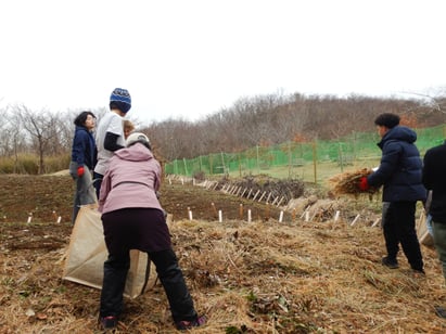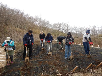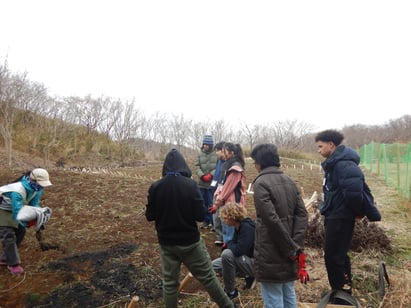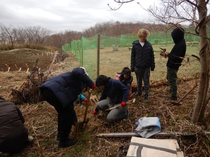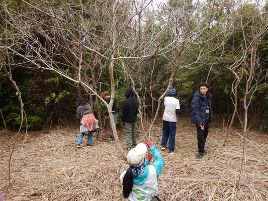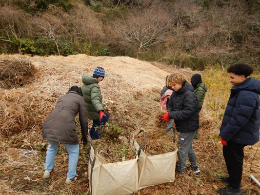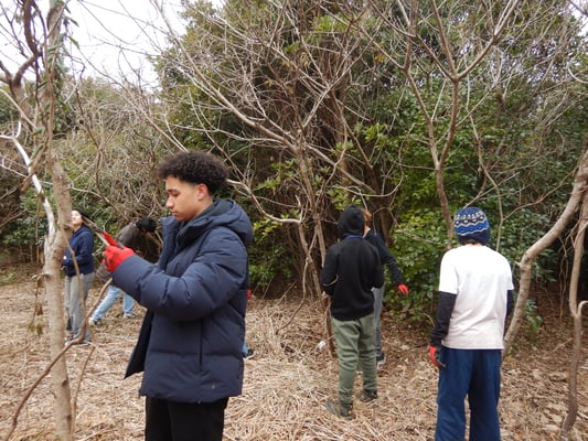 The Montessori School of Tokyoでは、2023年から学校のカリキュラムへ森づくり体験や座学を展開されております。2月3日は、都内に暮らし、学ぶ子どもたちに自然の豊かさ、自然環境を守っていくことの大切さを伝え、そして現在までに再生された森により、生物多様性がどの様に保護されているのかを観察するために、中学生の児童6名と学校関係者2名が自然共生サイト認定地である湘南国際村めぐりの森へ環境体験に来場されました。曇り空の中の肌寒さも感じさせず、春の植樹地のための作業に勤しんでくれました。