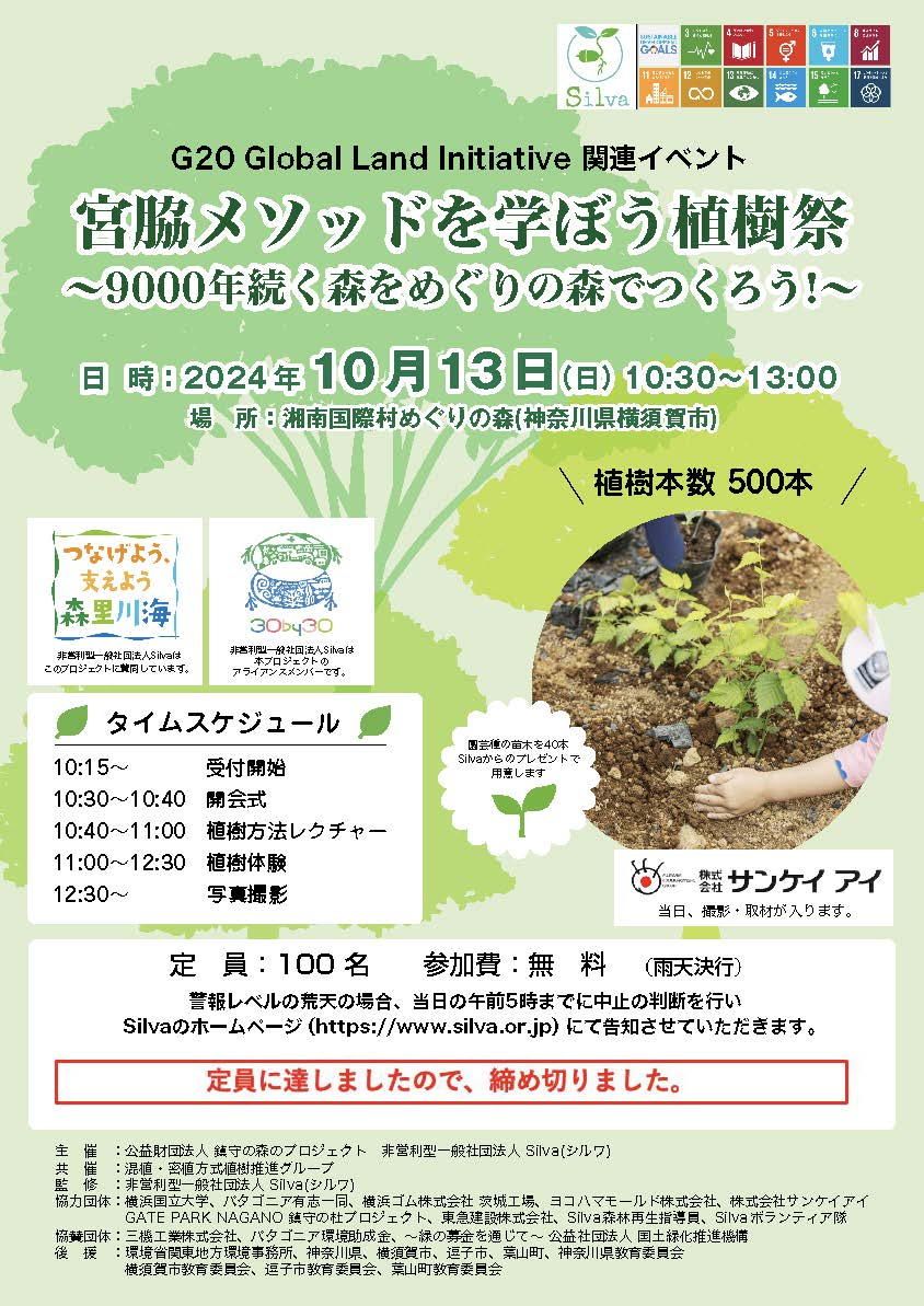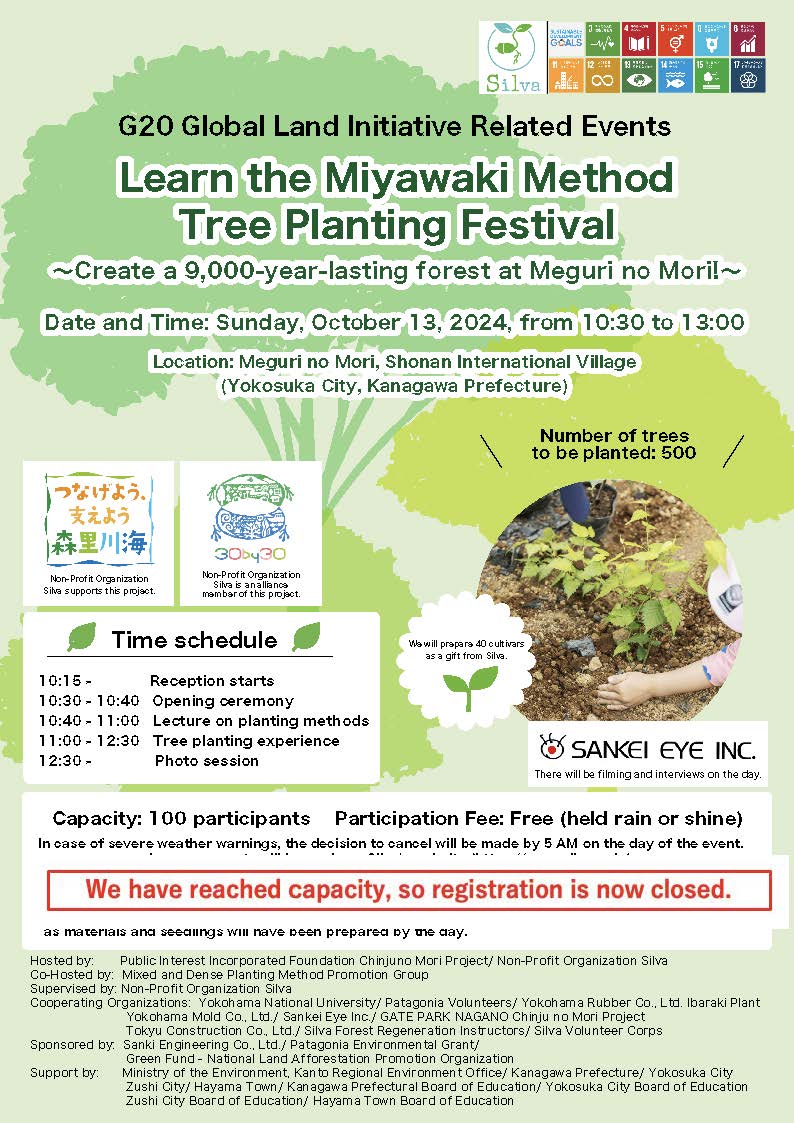G20 Global Land Initiative (G20の中の地球環境に関するセクション)主導の国際シンポジウムが 横浜国立大学で2024年10月11日に開催されます。同シンポジウムにて、土壌づくりから調査まで盛り込んだ Silva の学校事例も発表させていただきます。その後10月13日(日)に、湘南国際村めぐりの森において 「学校における宮脇式森づくりと環境教育」を目的とした、 宮脇昭横浜国立大学名誉教授が提唱された 土地本来の樹種である常緑広葉樹を中心にした混植・密植方式に基づく植樹祭を行います。 植樹祭終了後は、教育機関での事例として、Silva が手掛ける葉山町立葉山小学校の『葉っぴぃの森』を G20 Global Land Initiative 使節団の皆さまにご視察いただく予定となります。