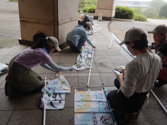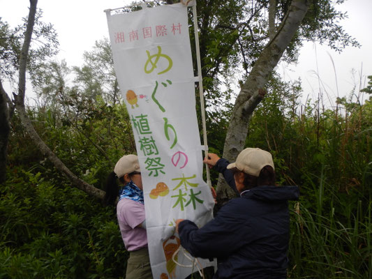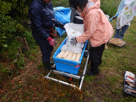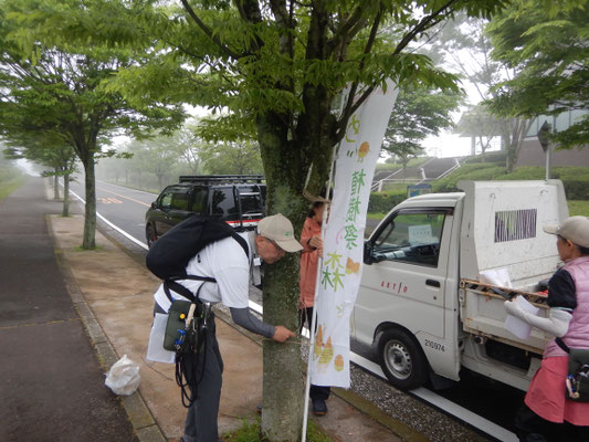 680名の来場予定の植樹祭がいよいよ明日と迫りました。前夜から降り続く雨を避けて、急遽、午後から準備作業を開始。直前でなければできないのぼり旗の設置や班プレートの位置確認、お蕎麦屋さんの割り箸を植樹祭でリユースするため、班毎へ仕分けと配置・アート作品の枠組みづくり・会場設営の資材の荷積みなどなど、13:00~17:30まで勤しみました。